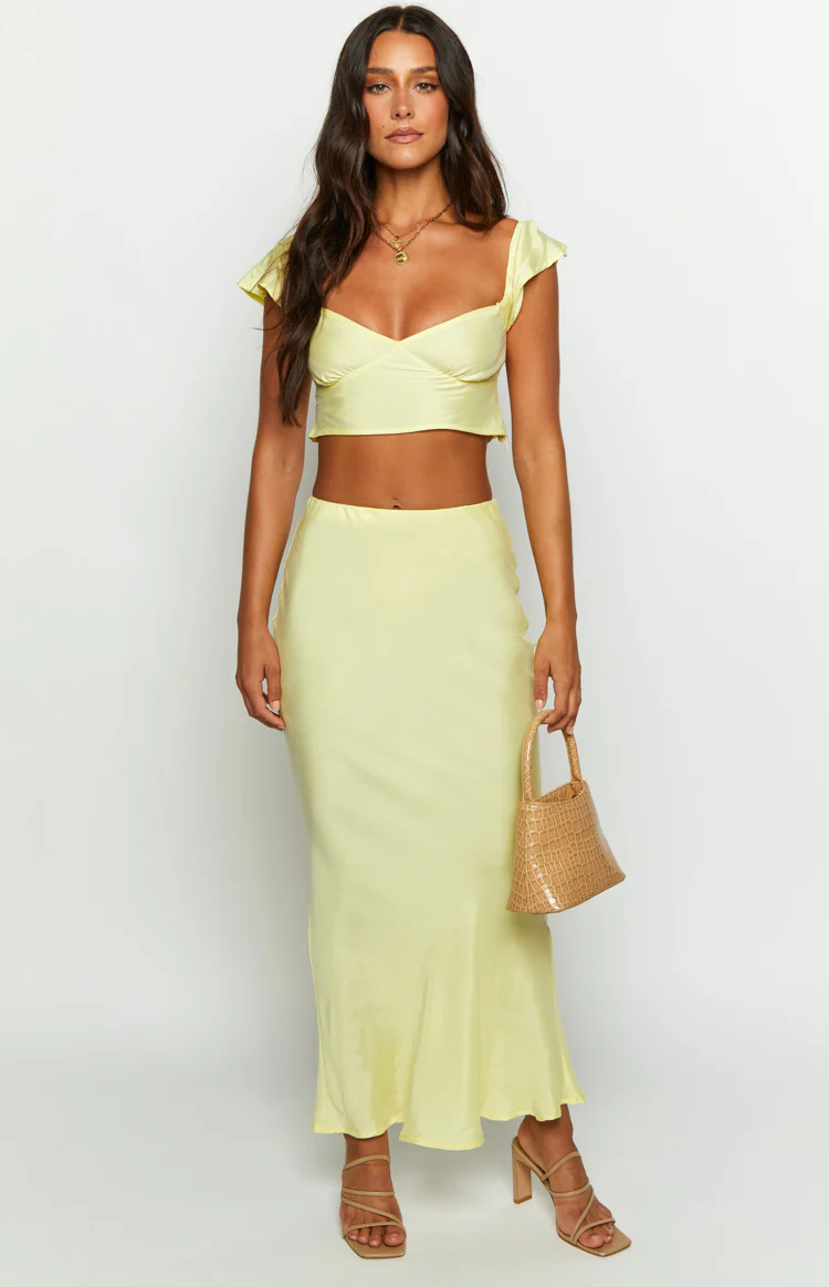 - Look super feminine and chic in the Anna two piece set. Gold jewellery compliments this yellow really well! Use the maxi skirt to create more than one outfit by pairing it with a white top.