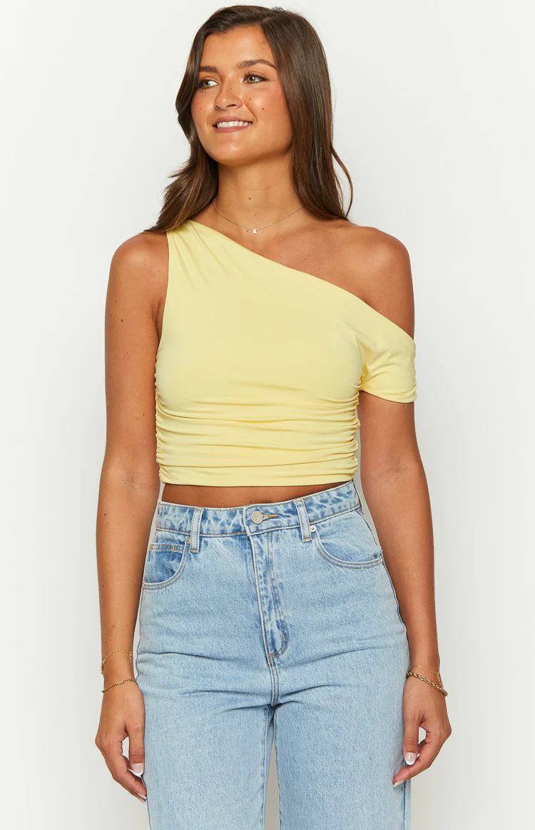 Limelight Drift Yellow Draped Off Shoulder Crop Top